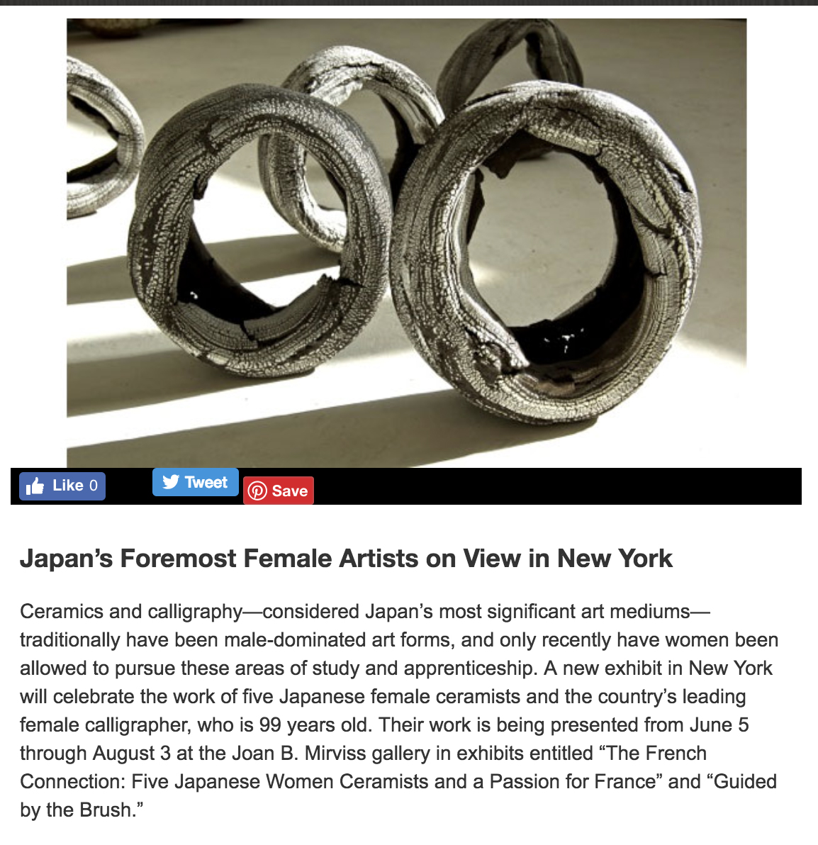 Ceramics and calligraphy—considered Japan’s most significant art mediums—traditionally have been male-dominated art forms, and only recently have women been allowed to pursue these areas of study and apprenticeship. A new exhibit in New York will celebrate the work of five Japanese female ceramists and the country’s leading female calligrapher, who is 99 years old. Their work is being presented from June 5 through August 3 at the Joan B. Mirviss gallery in exhibits entitled 'The French Connection: Five Japanese Women Ceramists and a Passion for France' and 'Guided by the Brush.'