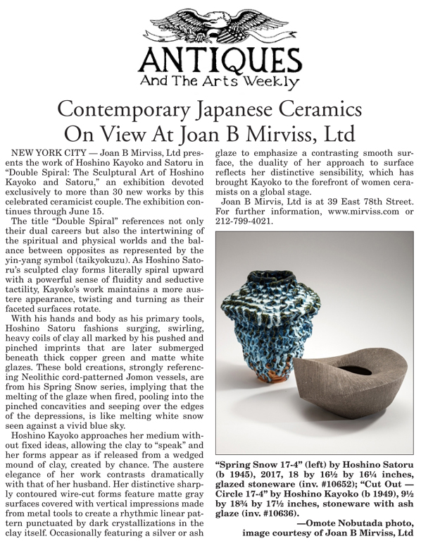 NEW YORK CITY - Joan B Mirviss, Ltd presents the work of Hoshino Kayoko and Satoru in "Double Spiral: The Sculptural Art of Hoshino Kayoko and Satoru," an exhibition devoted to more than 30 new works by this celebrated ceramicist couple. The exhibition continues through June 15.