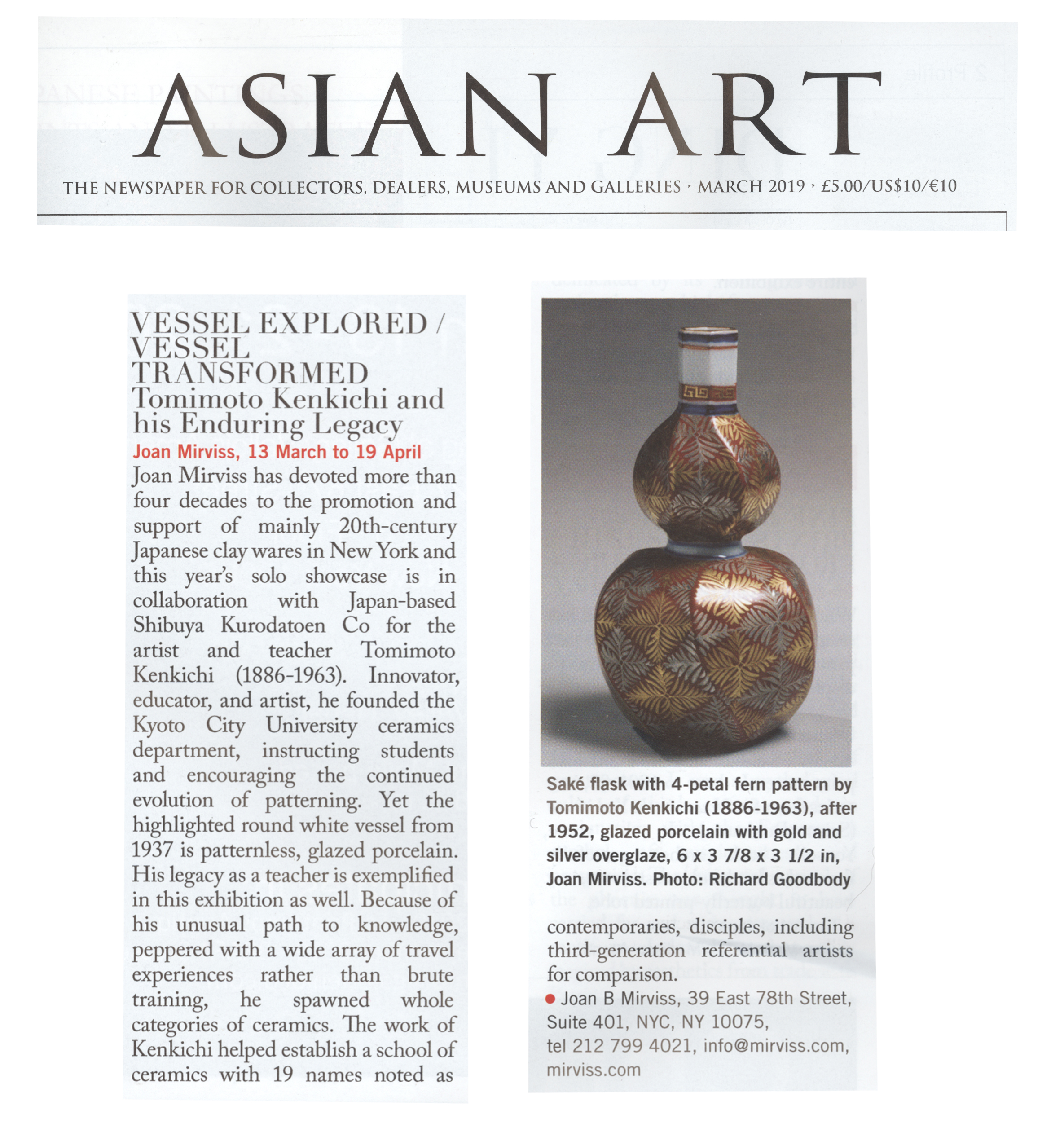 Joan Mirviss has devoted more than four dcades to the promotion and support of mainly 20th-century Japanese clay wares in New York and this year's solo showcase is in collaboration with Japan-based Shibuya Kurodatoen Co for the artist and teacher Tomimoto Kenkichi (1886-1963). Innovator, educator, and artist, he founded the Kyoto City University ceramics department, instructing students and encouraging the continued evolution of patterning. Yet the highlighted round white vessel from 1937 is patternless, glazed porcelain. His legacy as a teacher is exemplified in this exhibition as well. Because of his unusual path to knowledge, peppered with a wide array of travel experiences rather than brute training, he spawned whole categories of ceramics. The work of Kenkichi helped establish a school of ceramics with 19 names noted as contemporaries, discplines, including third-generation referential artists for comparison.