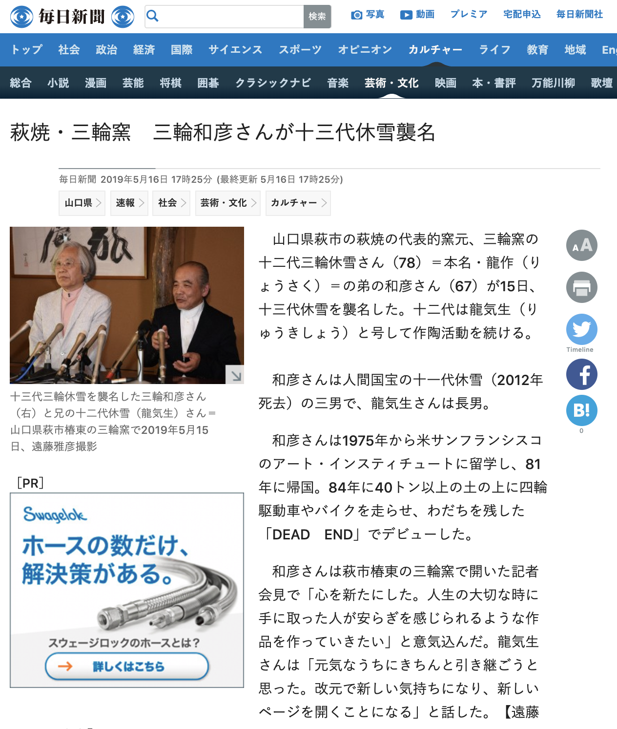 We are pleased to announce that as of May, 2019, Miwa Kazuhiko (b. 1951) has assumed the family title of Miwa Kyūsetsu XIII after his brother, Miwa Kyūsetsu XII (Ryōsaku)'s retirement. Miwa Kyūsetsu XII will continue creative activity but under the name Ryūkishō. This transfer marks the continuation of the ceramic lineage of the Miwa family which has, for four centuries, been the most celebrated family working in the Hagi tradition.