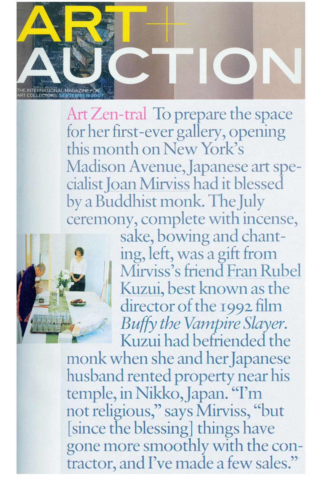 To prepare the space for her first-ever gallery, opening this month on New York's Madison Avenue, Japanese art specialist Joan Mirviss had it blessed by a Buddhist monk. The July ceremony, complete with incense, sake, bowing, and chanting, left, was a gift from Mirviss's friend Fran Rubel Kuzui, best known as the director of the 1992 film Buffy the Vampire Slayer. Kuzui had befriended the monk when she and her Japanese husband rented property near his temple, in Nikko, Japan. "I'm not religious," says Mirviss, "but [since the blessing] things have gone more smoothly with the contractor, and I've made a few sales."