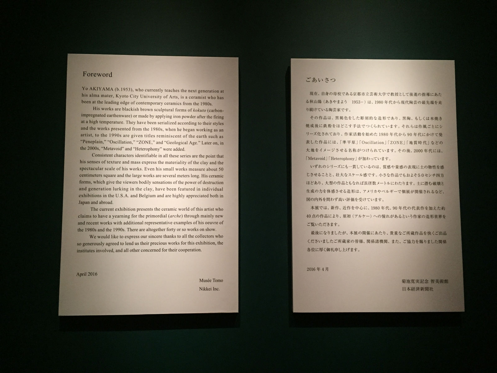 Akiyama Yō's major retrospective exhibition on view at the Musée Tomo in Tokyo from April 2 to July 24, 2016.