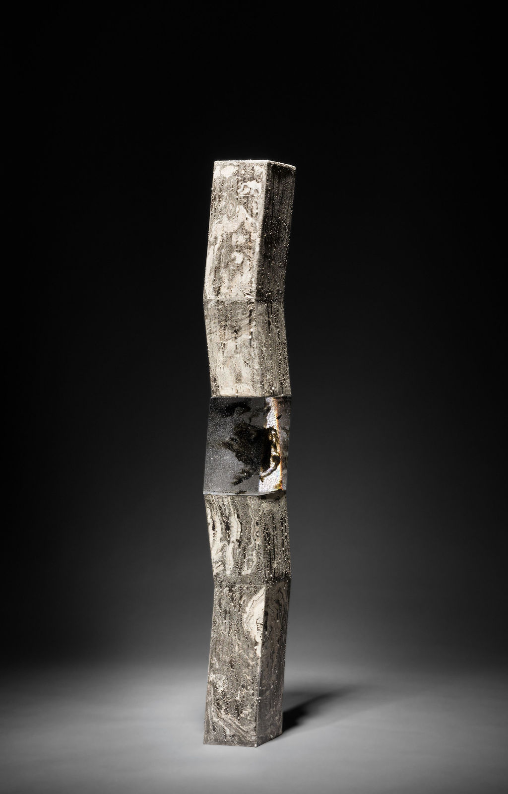 In Kato Tsubusa’s 3-foot-tall sculpture, “Object,” you can feel the ceramist stretching, slicing and pinching the thick slabs of white porcelaneous clay that rise into a soaring, ragged peak—and sense the slow pouring of pale celadon glaze so that it flows down the sides and pools at the base like melted snow. In Maeta Akihiro’s white porcelain pot, however, the artist’s hand is invisible. After shaping the small mouth, tapering the base, flaring and faceting the body, the artist ran a blade over the surface, erasing all traces of his fingers and palm. The result is a work whose heft and purity of form exude calm.