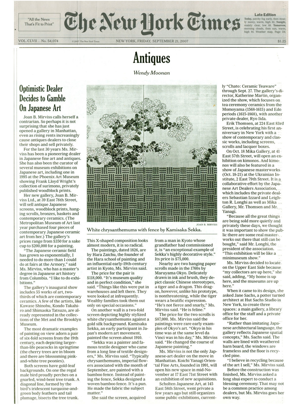 Joan B. Mirviss calls herself a contrarian. So perhaps it is not surprising that she has just opened a gallery in Manhattan, even as rising rents increasingly cause antiques dealers to close their shops and sell privately. For the last 30 years, Ms. Mirviss has been a pioneering dealer in Japanese fine art and antiques. She has also been the curator of several museum exhibitions on Japanese art, including one in 1995 at the Phoenix Art Museum showing Frank Lloyd Wright's collection of surimono, privately published woodblock prints.